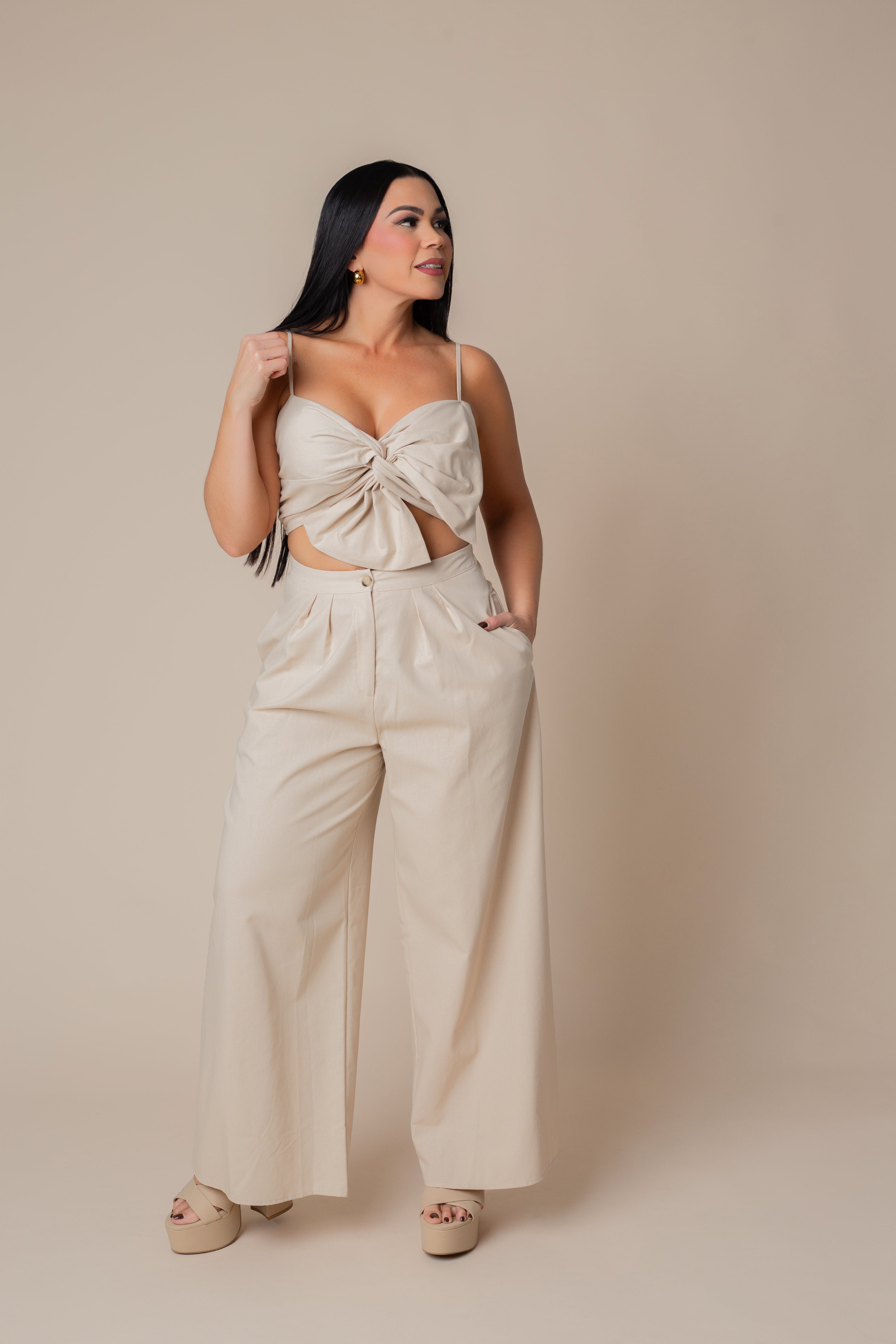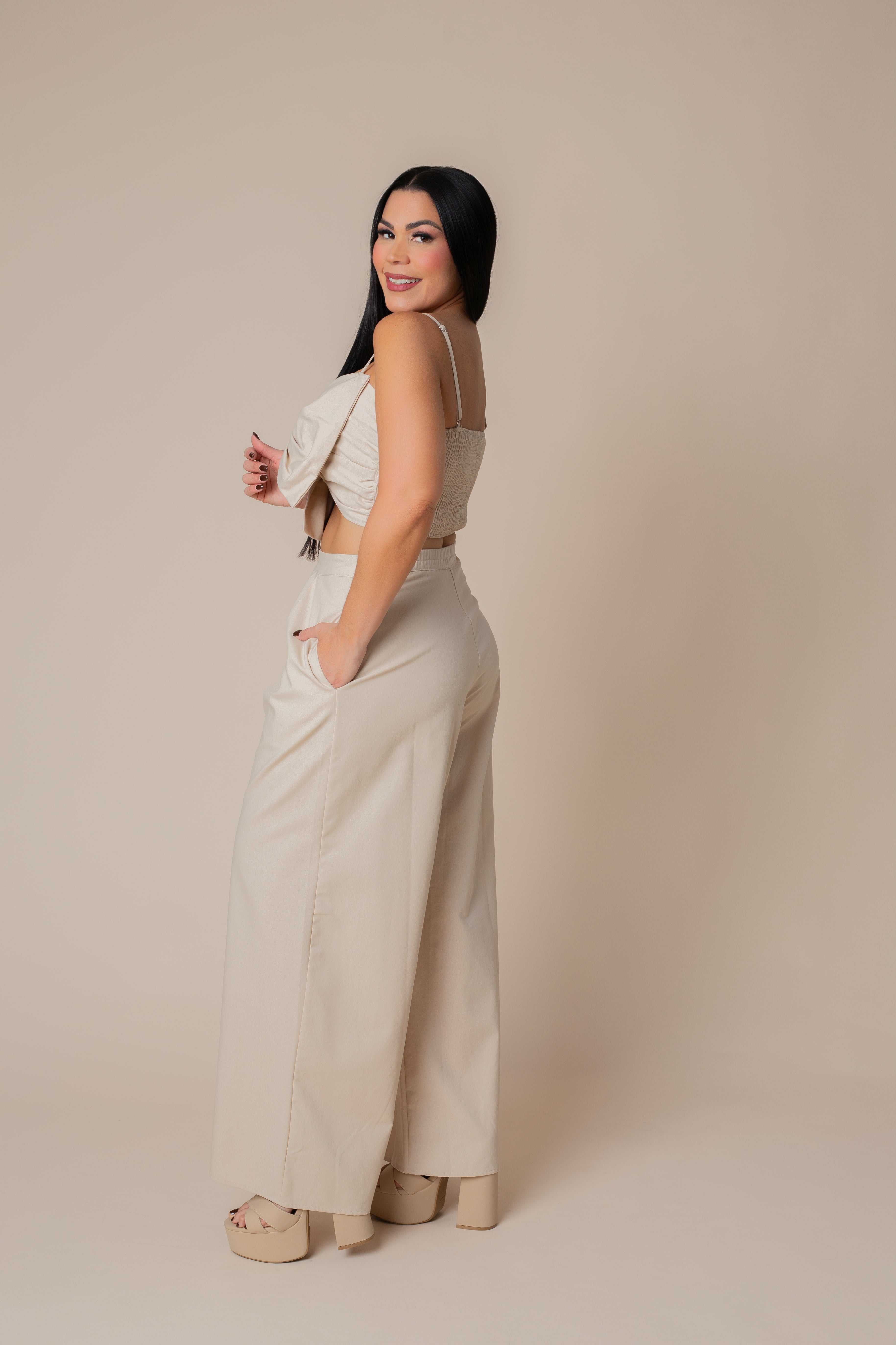 Thin Adjustable Strap Ribbon Top & High Waisted Long Pants Set.