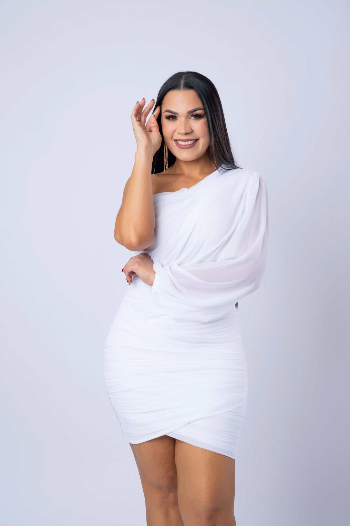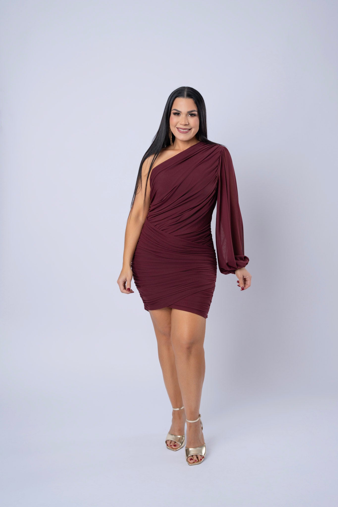 One Shoulder Rushed Mesh Mini Dress