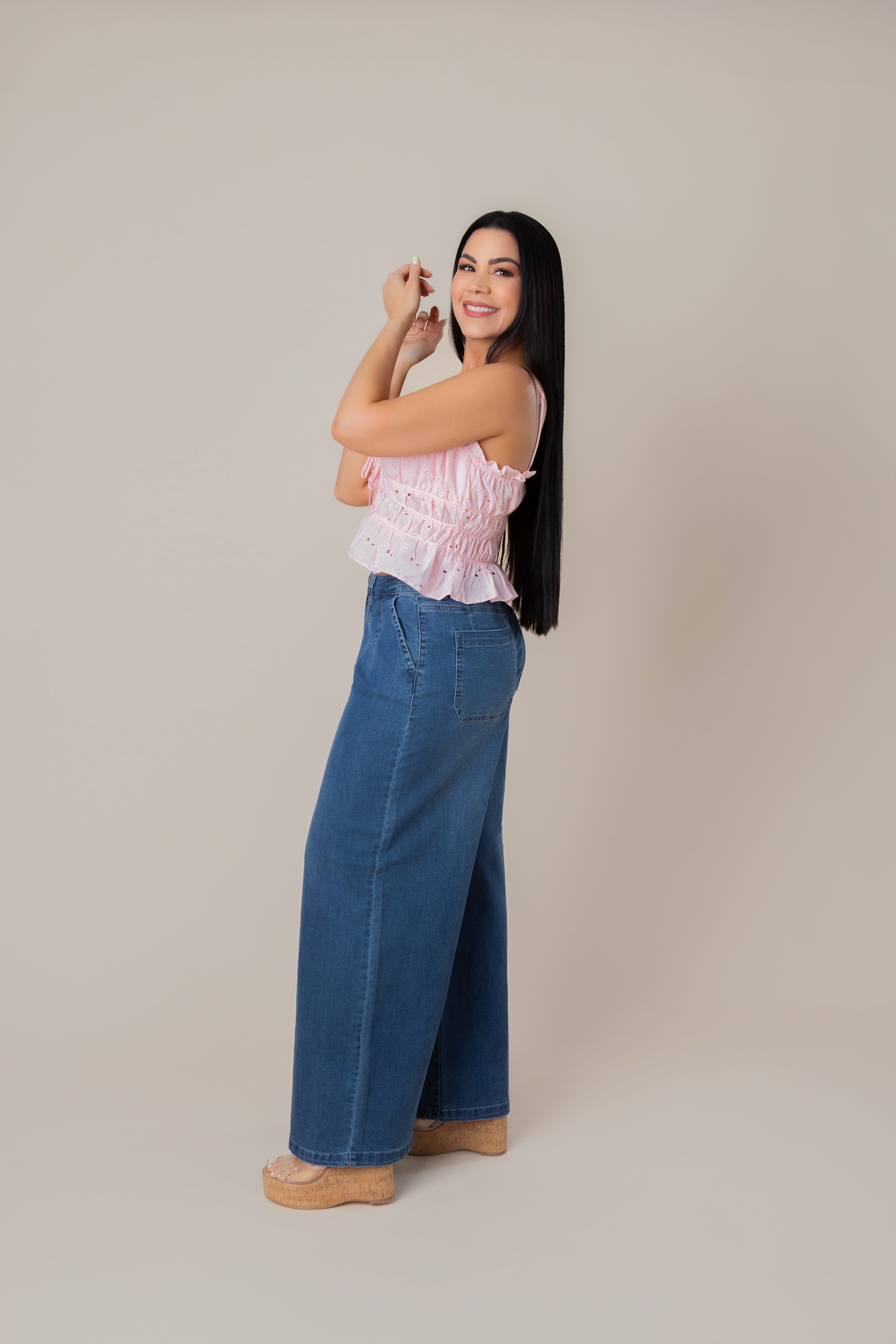 Mid Rise Fit Wide Leg Knit Denim Look Jeans.