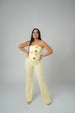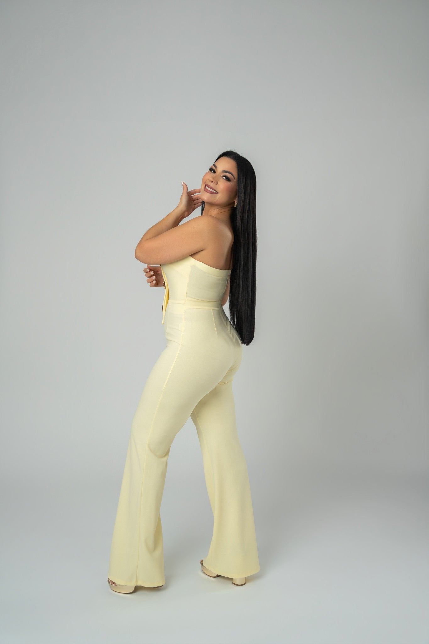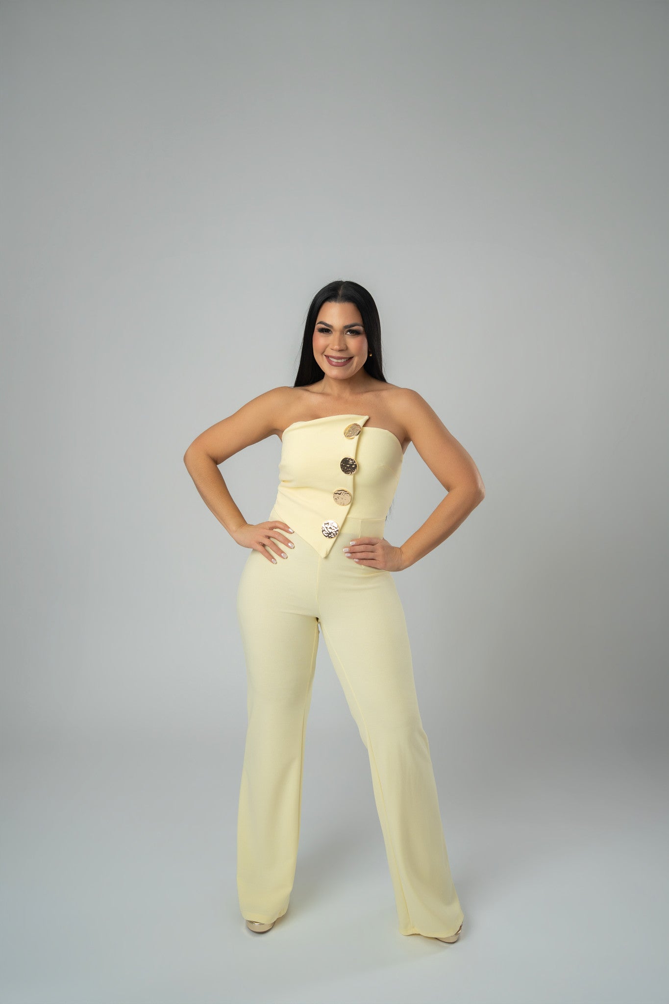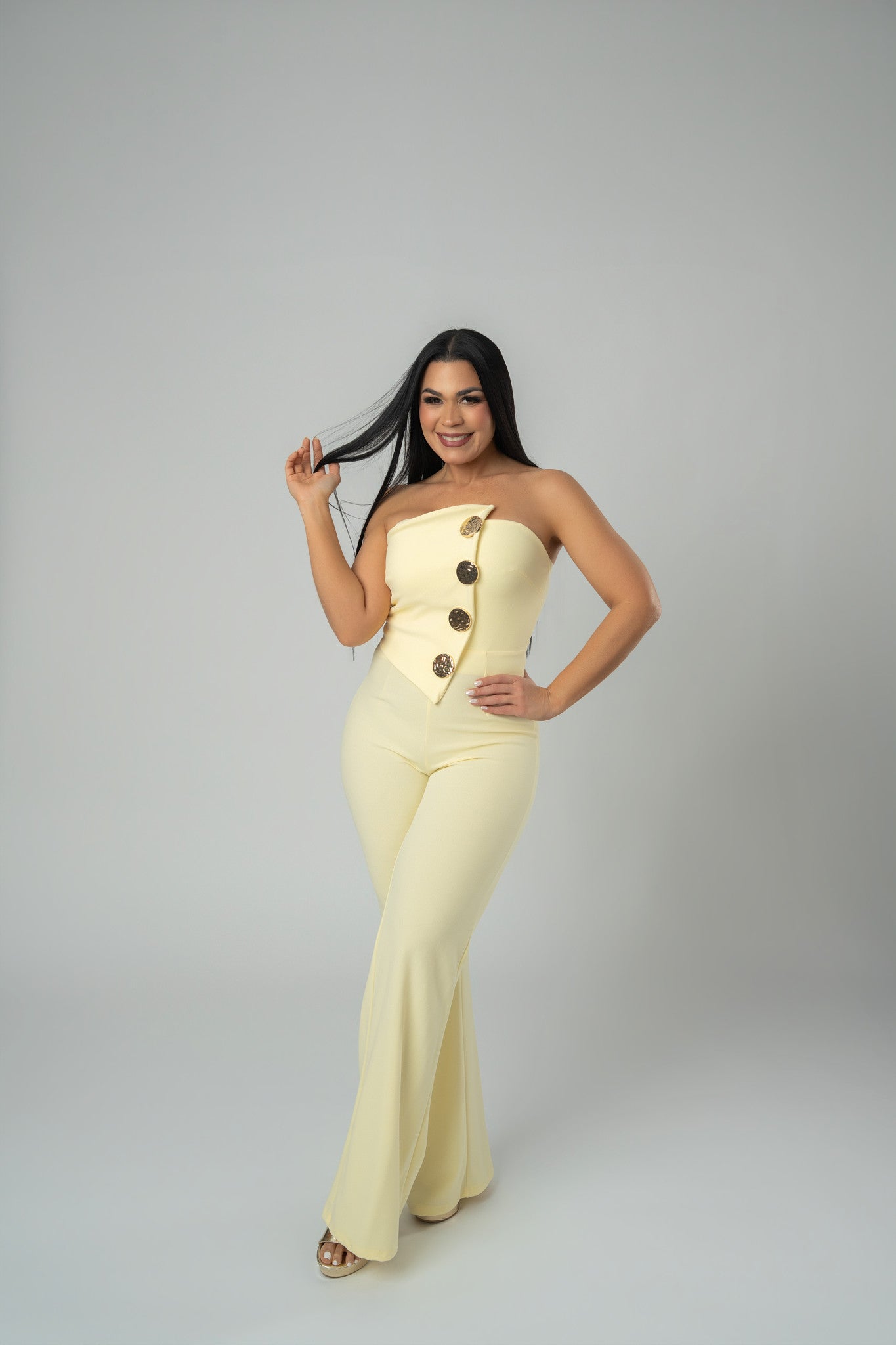 Off Shoulder Button Trim Detailed Fashion Jumpsuit Overlap Detail, Sleeveless And Zipper In The Back.