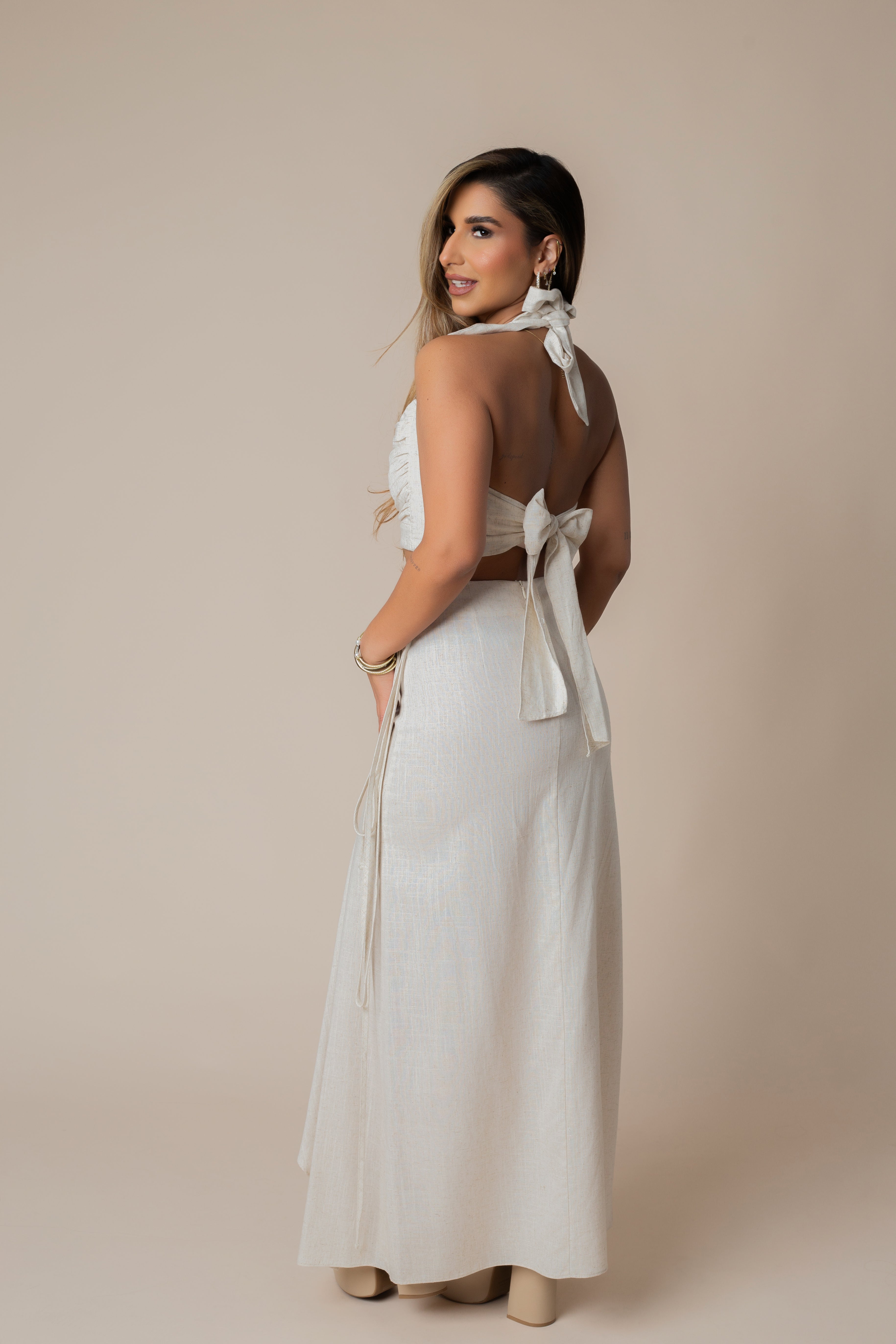 Halter Tie Back Chest Top & High Waisted Linen Skirt Set.