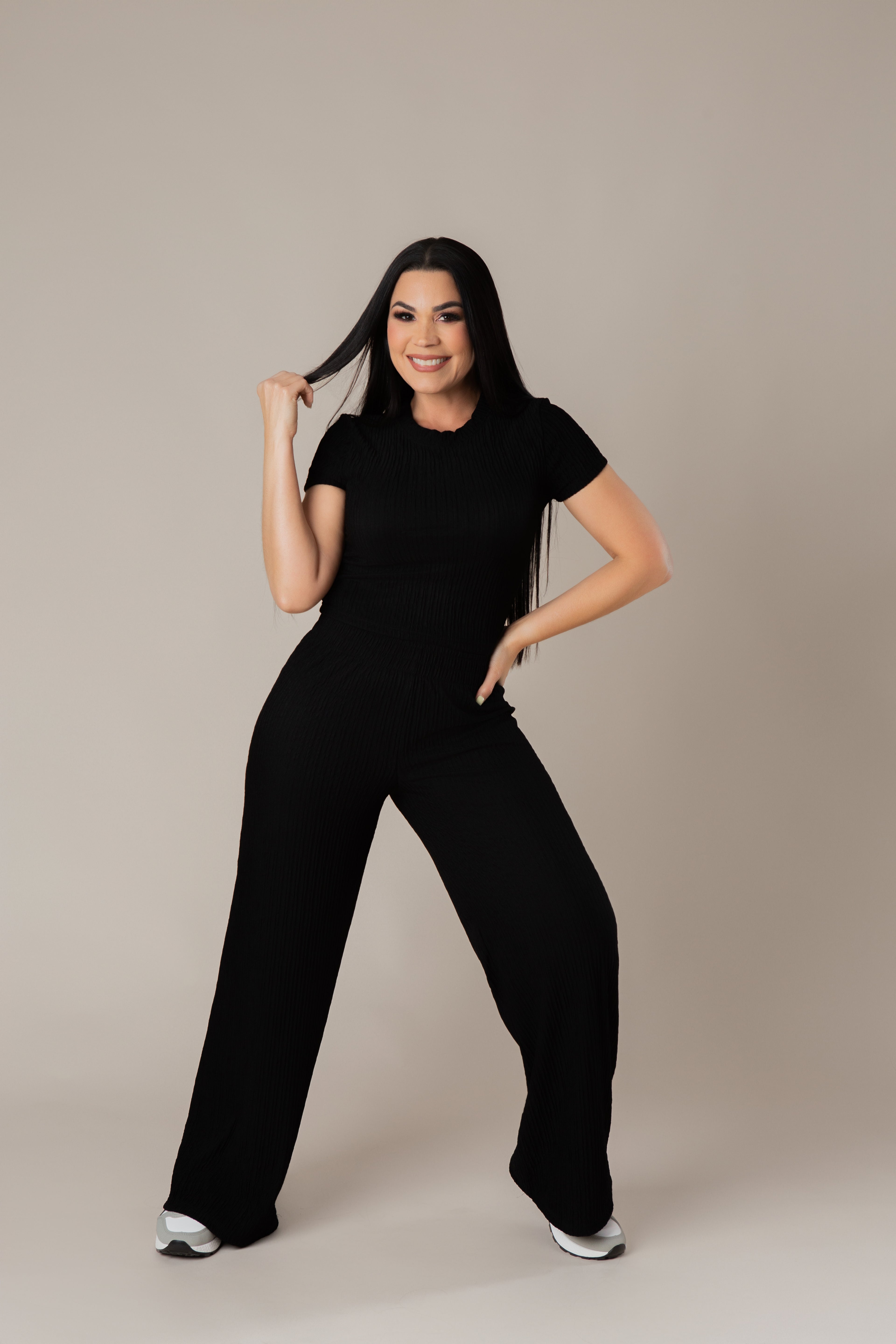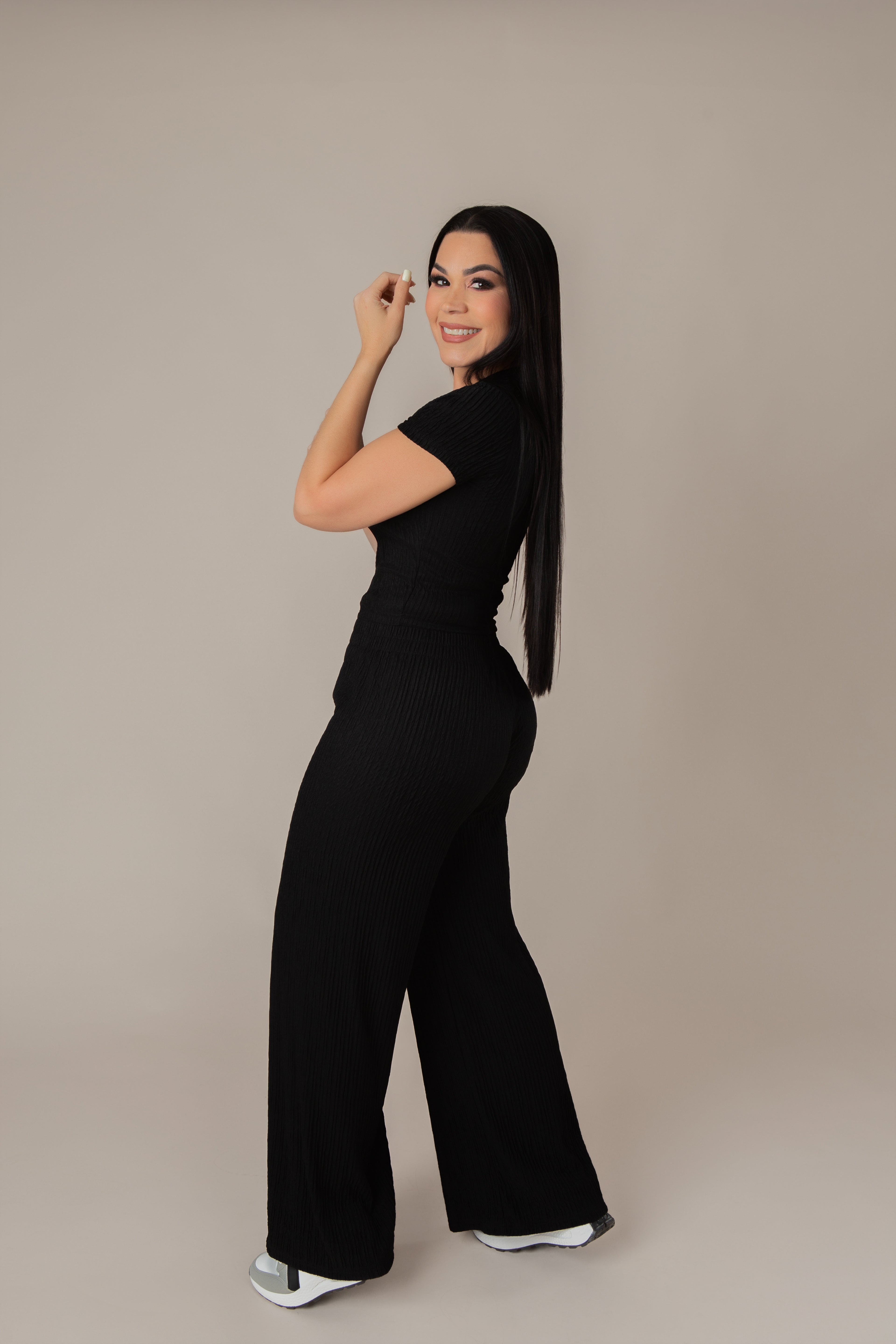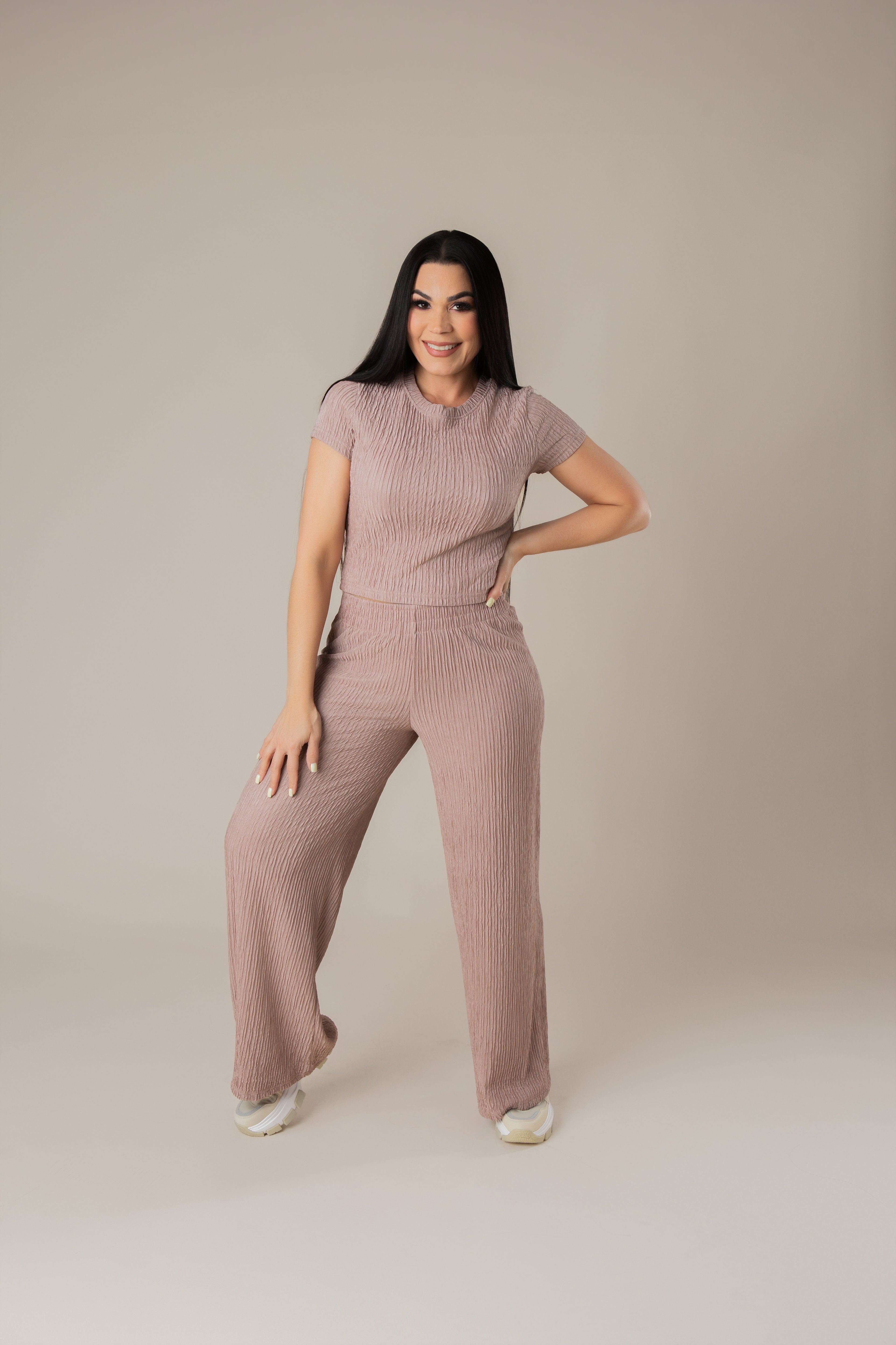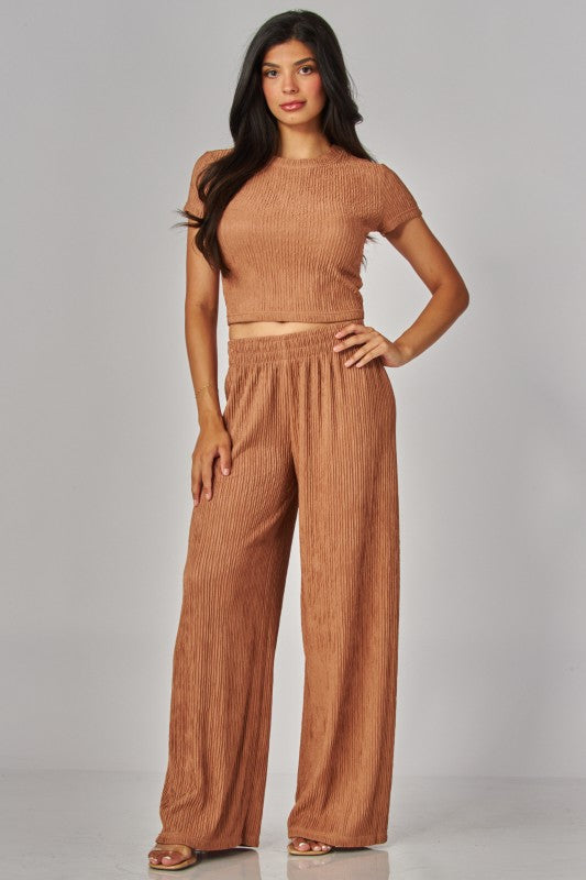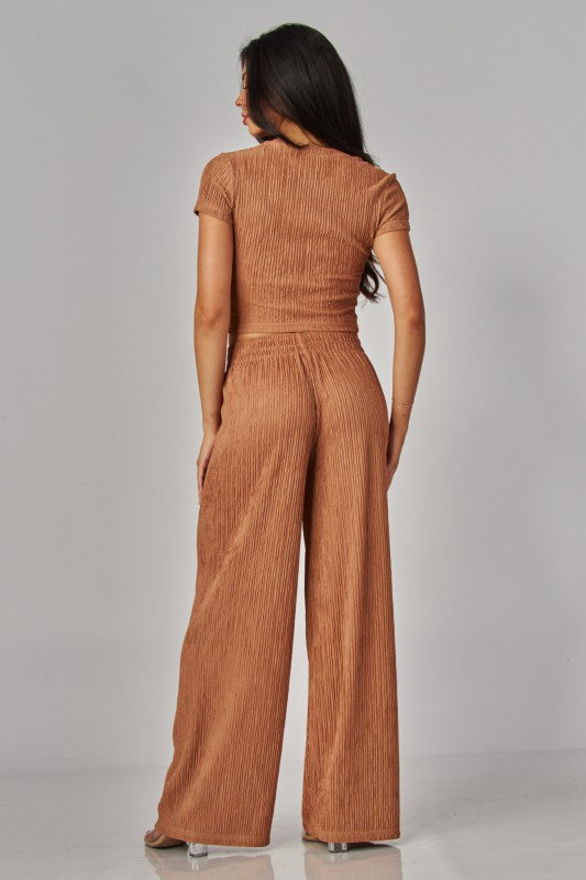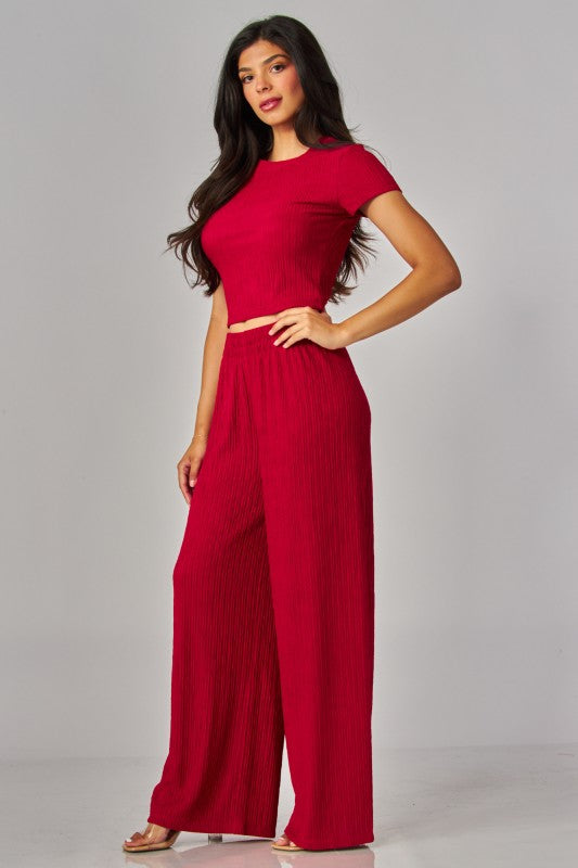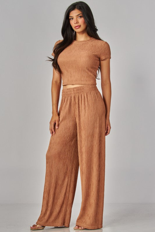 Short-Sleeved Top And Pants Set With Wrinkled Pleats.