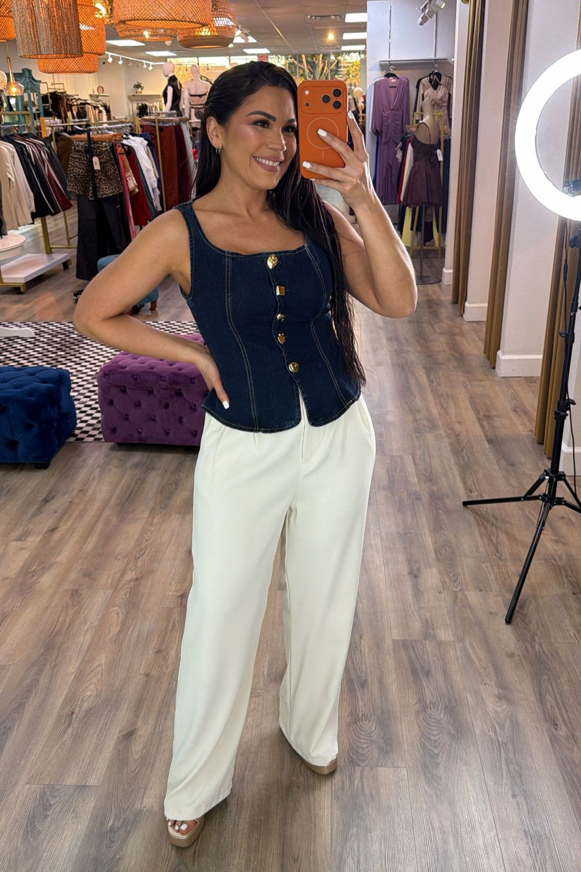 Sleeveless Denim Vest With Gold Button Details.